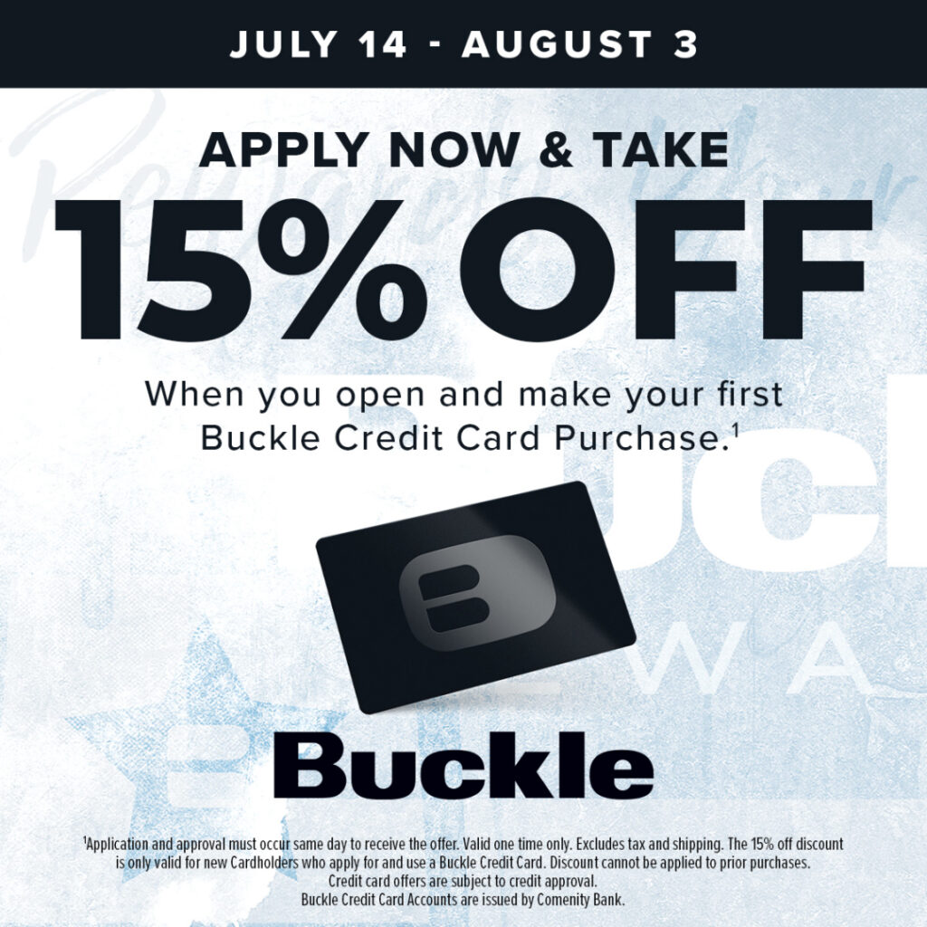 From July 14 – August 3 save 15% when you open and make your first Buckle Credit Card purchase.